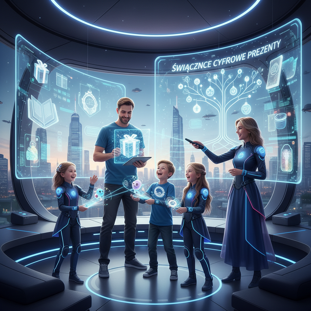 Polska rodzina wymieniająca cyfrowe prezenty w nowoczesnej, futurystycznej scenerii.